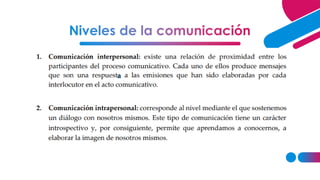 La comunicación es un proceso complejo influenciado por diversos factores como la cultura y el estado de ánimo. Involucra la transmisión de mensajes simbólicos entre un emisor y receptor a través de diferentes canales y códigos. Puede ser verbal, a través de palabras, o no verbal mediante gestos y expresiones. El objetivo es compartir significados e ideas.