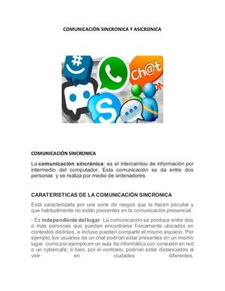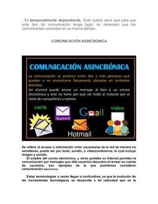 La comunicación sincrónica requiere que los comunicantes coincidan en tiempo y lugar, mientras que la comunicación asincrónica es independiente del lugar y temporalmente independiente, permitiendo que los participantes interactúen en diferentes momentos. Algunos ejemplos de comunicación asincrónica son el correo electrónico y los foros en Internet, donde los mensajes pueden enviarse y leerse en diferentes tiempos.