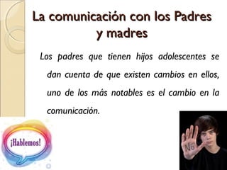 El documento discute la importancia de la comunicación entre padres e hijos adolescentes. Señala que los adolescentes valoran poder acudir a sus padres durante momentos difíciles a pesar de la rebeldía. Sin embargo, ven cambios en la comunicación como hablar menos y sentirse menos comprendidos. El documento enfatiza la necesidad de escuchar, conversar, transmitir normas y expresar afecto para mantener una relación sana a través del diálogo.