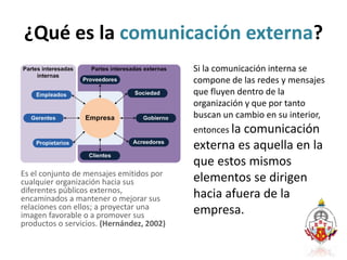 Este documento define la comunicación externa como los mensajes que una organización envía a sus públicos externos para mantener o mejorar sus relaciones con ellos. Explica que la comunicación externa incluye estrategias como las relaciones públicas, la imagen institucional y la publicidad. También identifica varios públicos externos clave como accionistas, autoridades, distribuidores y clientes, y describe los tipos de comunicación externa operativa, estratégica y de notoriedad.