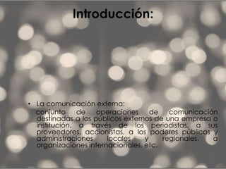 Este documento habla sobre la importancia de tener una comunicación externa efectiva en una empresa. Explica que la comunicación externa se refiere a las operaciones de comunicación dirigidas a públicos externos como periodistas, proveedores y poderes públicos. También señala que la comunicación externa es importante para que una empresa se maneje de acuerdo a sus valores y objetivos, y cómo esta contribuye a las relaciones y la imagen de la empresa si es efectiva.