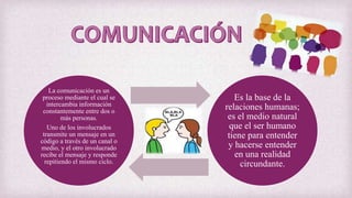 La comunicación es un proceso mediante el cual se intercambia información entre dos o más personas. Involucra a un emisor que transmite un mensaje a través de un canal, y a un receptor que recibe el mensaje. Una comunicación efectiva en la familia es clara, congruente, oportuna, verificadora y permite retroalimentación. Esto fortalece las relaciones familiares y el desarrollo emocional de sus miembros.
