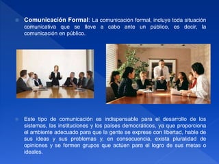 El documento contrasta la comunicación formal e informal. La comunicación formal incluye situaciones comunicativas públicas como paneles, mesas redondas, discursos y asambleas. La comunicación informal es cotidiana y espontánea, e incluye conversaciones, coloquios y diálogos entre pequeños grupos. Ambos tipos de comunicación son importantes para el desarrollo de sistemas y sociedades democráticas.