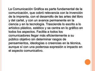 La Comunicación Gráfica es fundamental para la comunicación y cobró relevancia con la imprenta y el desarrollo de las artes del libro y el cartel. Trasciende lo escrito a lo artístico plástico y estético, centrándose en lo gráfico para facilitar que los comunicadores lleguen de manera eficiente a su público objetivo. El Comunicador Gráfico resuelve problemas comunicativos utilizando lenguajes gráficos, audiovisuales y multimediales para crear estrategias de comunicación.