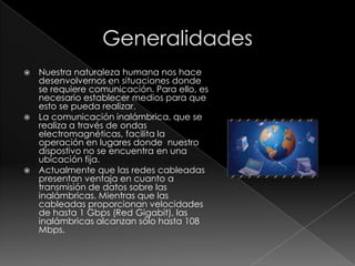 El documento describe brevemente la historia y el desarrollo de las comunicaciones inalámbricas desde la postulación de las ondas electromagnéticas por Maxwell y Hertz hasta las modernas redes WiFi, Bluetooth y celulares. También explica los diferentes tipos de comunicaciones inalámbricas según el rango de frecuencias y distancias cubiertas, como las ondas de radio, microondas y infrarrojos.