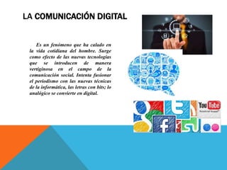 El documento habla sobre la comunicación digital. Explica que surge como resultado de las nuevas tecnologías que se introducen rápidamente en el campo de la comunicación social, fusionando el periodismo con las nuevas técnicas de la informática. También describe conceptos como la interactividad en la comunicación, las características de la Web 1.0, 2.0 y 3.0, y diferentes elementos y herramientas de la comunicación digital como hipervínculos, páginas web, buscadores, HTML y redes sociales.