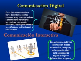 Este documento describe varios conceptos clave relacionados con la comunicación digital y la web. Explica la diferencia entre la Web 1.0, Web 2.0 y Web 3.0, e introduce conceptos como hipervínculos, URL, HTML, contenido multimedia, formatos de imágenes digitales, blogs, periodismo digital, redes sociales, wikis y chats.