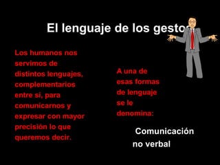 Este documento describe los diferentes aspectos de la comunicación no verbal, incluyendo gestos, expresión facial, mirada, postura y proxémica. Explica que la comunicación no verbal constituye una gran parte de cómo nos comunicamos y cómo podemos transmitir diferentes emociones a través de nuestro lenguaje corporal de manera innata o aprendida. Además, detalla las diferentes clasificaciones de gestos y cómo podemos interpretar las expresiones faciales de otras personas.