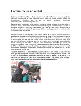 La comunicación no verbal implica la transmisión y recepción de mensajes sin palabras a través de gestos, lenguaje corporal, expresiones faciales y contacto visual. Surge antes del desarrollo del lenguaje y también se da en animales no humanos. Aunque a menudo acompaña a la comunicación verbal matizándola o ampliándola, la audiencia procesa simultáneamente los aspectos verbal y no verbal de un mensaje.