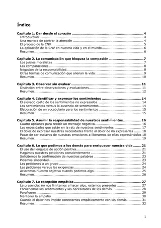 Este documento presenta los principios de la Comunicación No Violenta (CNV), un enfoque para la comunicación compasiva desarrollado por Marshall Rosenberg. Se describe el proceso de la CNV, que implica observar sin evaluar, identificar sentimientos y necesidades, asumir responsabilidad por los sentimientos, y hacer peticiones positivas. También se cubren temas como la empatía, la expresión de emociones como la ira, el uso de la fuerza, y expresar agradecimiento a través de la CNV. El objetivo general es fom