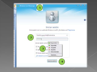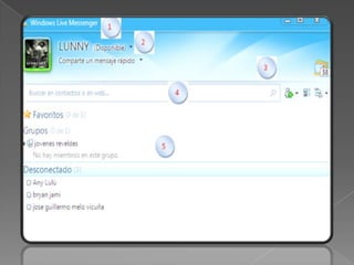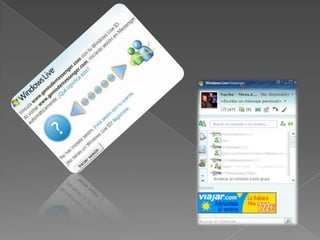 El documento describe las herramientas de comunicación en Internet como el chat, mensajería instantánea y videoconferencias. Luego se enfoca en el servicio de mensajería instantánea MSN/Messenger, explicando sus ventajas como la comunicación gratuita a larga distancia y la capacidad de cambiar el estado y mostrar fotos de perfil. Finalmente, detalla los pasos para iniciar sesión en Messenger y las diferentes áreas y herramientas disponibles en la interfaz como charlas grupales, voz y envío de archivos.