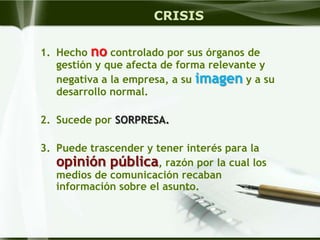 Este documento describe diferentes tipos de crisis y cómo comunicarse durante una crisis. Identifica crisis técnicas, políticas, endógenas y exógenas. Explica las fases de una crisis - preliminar, aguda, crónica y postraumática. También detalla estrategias de comunicación durante una crisis, incluyendo el silencio, la negación y la transferencia de responsabilidades.
