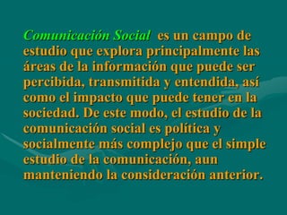 La comunicación social explora las áreas de la información, su transmisión y comprensión, así como su impacto en la sociedad. Se define como un campo interdisciplinario que estudia los medios de comunicación masiva e industrias culturales desde perspectivas sociológicas. Dos teóricos importantes son Pierre Bourdieu y su teoría del habitus y campo, y Eliseo Verón y su teoría de los discursos sociales.