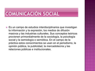 La comunicación social es un campo interdisciplinario que estudia la información, los medios masivos y las industrias culturales. Sus conceptos teóricos provienen de la sociología, psicología social y semiología. Estos conocimientos se aplican en periodismo, opinión pública, publicidad, mercadotecnia y relaciones públicas. Analiza los modelos de comunicación que incluyen emisor, receptor, canal, código y mensaje, así como el contexto.