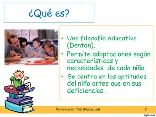 La comunicación total es una filosofía educativa para niños sordos o con dificultades para comunicarse que utiliza una variedad de estrategias como la lengua de signos, gestos, lectura labial, escritura y elementos visuales para adaptarse a las necesidades individuales de cada niño y centrarse en sus aptitudes en lugar de sus deficiencias.