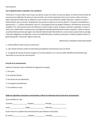 El documento define la comunicación como hacer saber a otros lo que uno piensa, siente o desea. Explica que aunque hablar es la forma más común y importante de comunicarse, no es la única, pues también se puede comunicar mediante gestos como los que usan los guardias de tráfico para dirigir el tráfico o las personas para responder "no" a una pregunta.