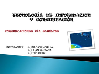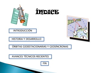 Este documento trata sobre las comunicaciones vía satélite. Brevemente describe la historia desde los primeros satélites pasivos que reflejaban señales hasta los satélites activos modernos. Explica las órbitas geoestacionarias y geosíncronas que permiten una cobertura continua. Finalmente, resume algunos avances técnicos recientes como el uso de TDMA y láseres.