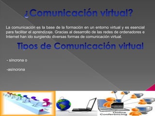 El documento describe dos formas de comunicación virtual para la enseñanza a distancia: la comunicación síncrona que permite interacciones en tiempo real como los chats y videoconferencias, y la comunicación asíncrona que no requiere coincidencia temporal como el correo electrónico y los foros de discusión. Proporciona ejemplos de herramientas para cada tipo de comunicación virtual.