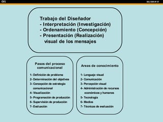 La comunicación visual domina nuestra cultura contemporánea. El diseñador juega un papel clave al planificar mensajes visuales con la intención de educar, persuadir e informar. La comunicación visual puede ser espontánea u organizada, e incluye tanto información práctica como estética. El mensaje visual se transmite a través de canales y puede verse afectado por interferencias y los filtros del receptor.