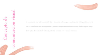 La comunicación visual es la transmisión de ideas a través de imágenes percepcibles, dividiéndose en intencional y casual. El mensaje visual puede ser consciente, con un objetivo determinado, o informal, dependiendo del contexto y la cultura del receptor. Actualmente, se aplica en publicidad, marketing digital y redes sociales, facilitando la comunicación en la era contemporánea.