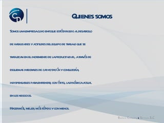 Esta empresa se enfoca en desarrollar habilidades y actitudes de trabajo en equipo a través de capacitación y consultoría para aumentar la productividad. Su misión es ofrecer soluciones integrales a organizaciones públicas y privadas para mejorar áreas administrativas, operativas y comerciales. Sus valores incluyen honestidad, confianza, comunicación abierta, entusiasmo y creatividad para entender las necesidades de los clientes.
