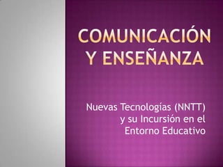 Este documento discute la comunicación y enseñanza, las nuevas tecnologías en el entorno educativo, y los problemas de la comunicación en la enseñanza relacionados con la relación espacio-tiempo. Explica que la comunicación requiere un emisor, receptor y mensaje, y que la enseñanza busca el aprendizaje. También describe las tecnologías de la información y la comunicación y sus usos educativos, así como sus impactos en la transformación de la educación. Finalmente, analiza cuatro situaciones relacionadas con la relación esp