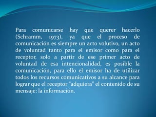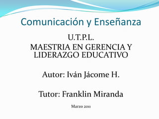 Este documento discute la comunicación y enseñanza en el contexto de la educación. Explica que la comunicación requiere la voluntad tanto del emisor como del receptor y que la calidad de la comunicación afecta la calidad del aprendizaje. También describe cuatro configuraciones posibles de la relación espacio-tiempo entre emisor y receptor en la comunicación educativa: mismo tiempo y lugar, mismo tiempo en lugares distintos, tiempos distintos en el mismo lugar, y tiempos y lugares distintos. Finalmente, identifica tres tipos de "filtros