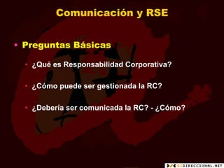 Este documento discute la función de la comunicación en la gestión de la responsabilidad social empresarial (RSE). Explica qué es la RSE, cómo puede gestionarse a través de enfoques altruistas, de marketing o de filosofía organizacional, y por qué la comunicación es importante para cada enfoque. La comunicación puede usarse tácticamente para mejorar la reputación o estratégicamente para establecer diálogo con los grupos de interés y adaptar mejor la empresa a su entorno.