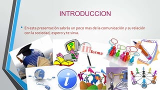 Este documento presenta información sobre la comunicación y la sociedad. Explica los procesos de comunicación, incluyendo el emisor, receptor, codificación, mensaje, medios, decodificación y retroalimentación. También describe los diferentes tipos de información como pública, privada, interna, externa, directa y semántica.