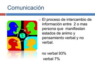 La comunicación implica el intercambio de información entre dos o más personas a través de señales verbales y no verbales. Existen cuatro elementos clave en la comunicación: el emisor, el canal, el código o mensaje, y el receptor. La comunicación puede ser verbal, que utiliza el lenguaje, o no verbal, que incluye la comunicación kinésica, proxémica y paraverbal. La comunicación tiene diversas funciones como informar, entretener o persuadir, y puede verse afectada por barreras semánticas, físicas o psicológicas.
