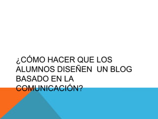 El documento propone diseñar un blog para estudiantes de séptimo grado con el objetivo de fomentar procesos comunicativos. Se explican los elementos de la comunicación y se detallan actividades como crear un calendario en Gmail, producciones literarias en el blog, comentarios en Scribd y mantener correspondencia escolar por correo electrónico. El proyecto se ubicaría en los niveles más altos de los estándares por competencias técnicas, evaluativas, pedagógicas, comunicativas y actitudinales.