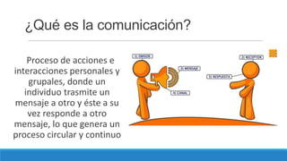 La comunicación es un proceso circular y continuo donde los individuos intercambian mensajes para poner ideas en común. Su origen se remonta a los primeros humanos que necesitaban relacionarse y cooperar mediante la imitación de sonidos, y aunque tiene muchos objetivos, todos comparten el propósito fundamental de compartir ideas.