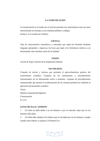 Este documento trata sobre varios temas relacionados con la comunicación y el lenguaje. Explica conceptos como la comunicación, las leyes de la comunicación, las partes de la comunicación, los tipos de lenguaje y más. También cubre temas de ortografía como las reglas de acentuación, signos de puntuación, clasificación de palabras y silabas.