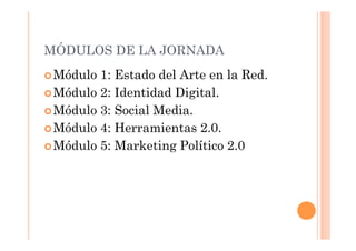 Este documento presenta los módulos de una jornada de formación sobre comunicación 2.0. Incluye cinco módulos: estado del arte en la red, identidad digital, social media, herramientas 2.0 y marketing político 2.0. Cada módulo cubre temas como el uso de Internet y redes sociales, la importancia de la identidad digital, ejemplos de plataformas sociales y buenas prácticas para usarlas en campañas políticas.
