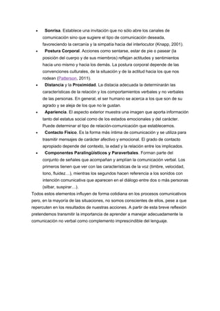 Este documento describe la importancia de la comunicación no verbal y sus elementos constituyentes. Señala que el 55% de la comunicación está relacionada con gestos faciales, el 38% con la voz y solo el 7% con el contenido verbal. Explica que la mirada, expresiones faciales, gestos, sonrisa, postura, distancia, apariencia, contacto físico y componentes paralingüísticos y paraverbales son elementos clave de la comunicación no verbal que influyen en los procesos comunicativos aunque no somos conscientes de ello. El documento