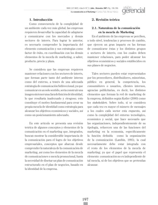 Este documento presenta una revisión teórica sobre la comunicación en el marketing. Explica que la comunicación es un proceso fundamental para que las empresas se conecten con los mercados y logren sus objetivos económicos y sociales. Describe los elementos de la mezcla promocional, que incluye la publicidad, ventas personales, promociones de ventas y relaciones públicas. También explica que el proceso de comunicación implica un emisor, mensaje, medios, receptor y retroalimentación.