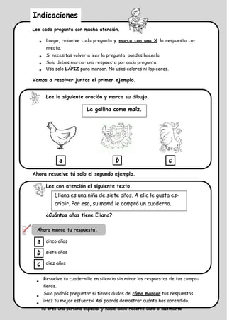 Este documento presenta una prueba de comprensión lectora para estudiantes de segundo grado de primaria. Consiste en varias preguntas sobre diferentes textos cortos para evaluar la comprensión de los estudiantes. Les pide leer atentamente cada texto y pregunta y marcar la respuesta correcta.