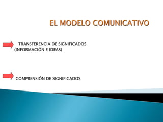 El documento discute los conceptos clave de la comunicación en las organizaciones. Explica que la comunicación controla el comportamiento formal e informal entre los miembros, fomenta la motivación y la retroalimentación, y permite la expresión emocional y el intercambio de información. También describe el proceso de comunicación, incluyendo la fuente del mensaje, la codificación, los canales, la decodificación y la retroalimentación.