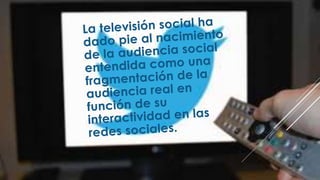 El documento analiza cómo Twitter complementa la televisión, permitiendo una interacción más cercana entre los espectadores y sus ídolos televisivos. Los resultados muestran que la actividad en Twitter de los presentadores y jurados de un programa influye en su éxito social. El documento concluye que Twitter y la televisión se complementan casi a la perfección al permitir a los espectadores acercarse más a sus famosos favoritos.