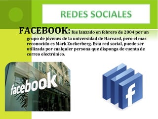 El documento describe varias redes sociales incluyendo Facebook, creado por Mark Zuckerberg en 2004; Twitter, creado por Jack Dorsey en 2006 para enviar y leer tweets; Myspace, una red social con perfiles, amigos y grupos lanzada en 2003; y otras como Hi5, Badoo, Orkut, Tagged y Ning, cada una con sus características y años de lanzamiento.