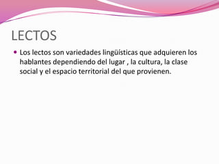 El documento describe diferentes variedades lingüísticas. Los lectos son variedades que dependen de factores como la ubicación geográfica, cultura y clase social. Los cronolectos son variedades influenciadas por el tiempo y usadas por grupos de edad, como el lenguaje infantil o juvenil. Los geolectos son variedades habladas en una zona geográfica específica. Los idiolectos son las peculiaridades del lenguaje de una persona. Los sociolectos son características lingüísticas típicas de una clase social.