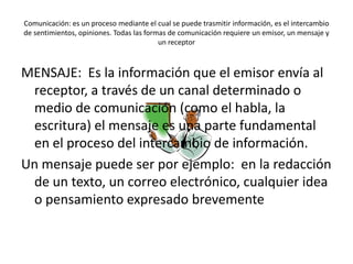 El documento define los elementos clave de la comunicación: el emisor codifica y transmite un mensaje a través de un canal o medio a un receptor. El emisor genera el mensaje, el canal es el medio físico por el que se transmite el mensaje, y el receptor descifra e interpreta el mensaje transmitido por el emisor. Los canales pueden ser personales como la voz o masivos como la escritura, radio, televisión o internet.