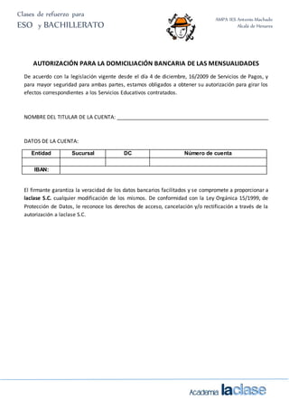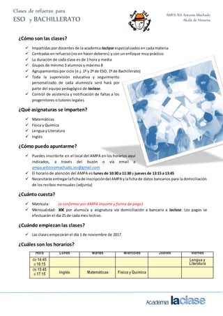 Este documento describe clases de refuerzo para estudiantes de ESO y Bachillerato impartidas por la academia laclase. Las clases se centran en el refuerzo práctico de asignaturas como Matemáticas, Física, Química, Lengua e Inglés en grupos pequeños de 3 a 8 alumnos. Cuestan 30€ por alumno y asignatura al mes y comenzarán el 1 de noviembre de 2017 con horarios específicos cada día de la semana.