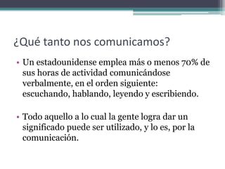 El documento discute los alcances y fines de la comunicación. Explica que los estadounidenses pasan el 70% de su tiempo comunicándose, principalmente escuchando, hablando, leyendo y escribiendo. También describe los roles de los profesionales de la comunicación como periodistas y artistas gráficos, así como los propósitos de informar, persuadir y entretener. Finalmente, resume los principales métodos de investigación en comunicación, incluyendo el método científico.