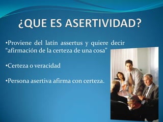 Este documento define la asertividad como la capacidad de expresar ideas, sentimientos y necesidades de manera directa, honesta y respetuosa sin herir a los demás. Explica que existen tres estilos de comunicación: pasividad, agresividad y asertividad. La comunicación asertiva se caracteriza por respetar las opiniones ajenas y expresar las propias de forma abierta. También presenta algunas técnicas para comunicarse de manera asertiva como el disco rayado y el banco de niebla.