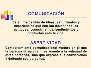 Este documento presenta las técnicas de comunicación asertiva. Describe tres estilos de comunicación: pasiva, agresiva y asertiva. Explica que la comunicación asertiva implica expresar ideas y sentimientos de manera directa y equilibrada sin herir a otros. También presenta técnicas como el uso de "mensajes yo", el "disco rayado" y la "interrogación negativa" para comunicarse de forma asertiva.
