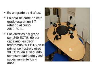 Este documento proporciona información sobre el grado de Comunicación Audiovisual de 4 años con 240 créditos ECTS. La nota de corte para el curso 2010-2011 fue de 8,7. Se detallan las asignaturas de cada curso, que abarcan temas como medios de comunicación, redacción, teorías de comunicación, realización audiovisual, gestión y derecho de los medios audiovisuales.