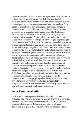 La comunicación entre padres e hijos es crucial pero también difícil, especialmente durante la adolescencia cuando los hijos buscan independizarse. Los padres deben esforzarse por entender las perspectivas y necesidades de sus hijos, encontrar momentos para escucharse mutuamente, y presentar un frente unido para guiar a los hijos a través de los desafíos del desarrollo.