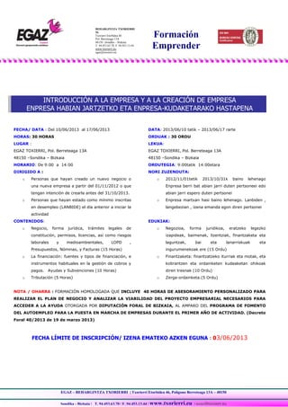 Este documento proporciona información sobre un curso de introducción a la empresa y creación de empresa que se llevará a cabo del 10 al 17 de junio de 2013 en EGAZ TOXIERRI en Sondika, Bizkaia. El curso durará 30 horas y estará dirigido a personas que hayan creado una nueva empresa desde noviembre de 2012 o tengan intención de crearla antes de octubre de 2013, o personas que hayan estado inscritas en desempleo. Los contenidos incluyen aspectos legales, financiación, tributación y