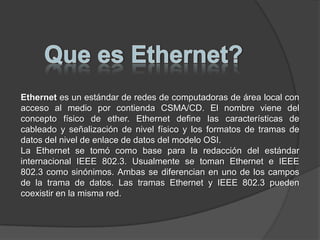 Ethernet es un estándar de red local que utiliza el protocolo CSMA/CD en la capa de enlace de datos. Fue desarrollado originalmente en Xerox PARC en los años 1970 por Robert Metcalfe y otros para conectar computadoras y compartir archivos e impresoras a altas velocidades. Ethernet ha evolucionado para soportar mayores velocidades de transmisión y diferentes tipos de cableado, y se ha convertido en el protocolo de red local más comúnmente utilizado.